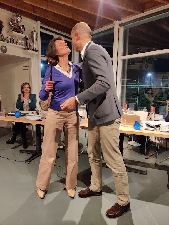 Berenike neemt de voorzittershamer over van Evert-Jan. Die wisseling had zich op de ledenvergadering van vorig jaar al aangekondigd. Oudgediende Marcel (niet slechts 10, 20 of 30 jaar lid, maar wel meer dan 55 jaar) neemt de accommodatieportefeuille van Berenike over en Sanne Beekhuis sprak ons vanuit een zonnig wintersportoord via het tv-scherm toe. Zij gaat financiën doen. Na afloop van de vergadering was ze plots life aanwezig. De wonderen zijn de wereld niet uit.