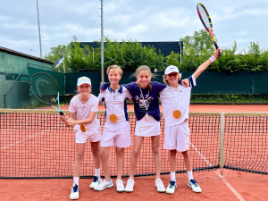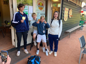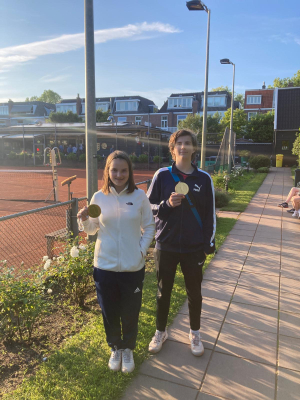 Dan nog die halve kampioen. Wij hadden ooit een vrijdagmiddag-jeugdteam (13-17 jaar). Daar waren er voor dit jaar nog twee van over: Jens en Karlijn. Gelukkig heeft Fleur goede relaties met Eindenhout. Het bleek dat ze voor de vrijdagmiddag daar driekwart-team hadden. Deze twee breuken zijn samengevoegd tot één heel team dat ingeschreven werd in de jongenscompetitie onder de naam Eindenhout 2. Jens en Karlijn wonnen alle wedstrijden, behalve de laatste dubbel afgelopen vrijdag die zij samen in een supertiebreak verloren. Maar de 2-2 tegen VVGA was genoeg om deze concurrent uit Amsterdam voor te blijven. Het was dus een kampioenschap voor Eindenhout, maar toch met een half team van ons. Van horen zeggen heb ik dat de onzen hun wedstrijden in het Eindenhoutteam wel in het HLTC-tenue speelden. Op de kampioensfoto kan ik dat niet zien. Omdat het inmiddels fris was, staan Jens en Karlijn daarop in trainingspak.