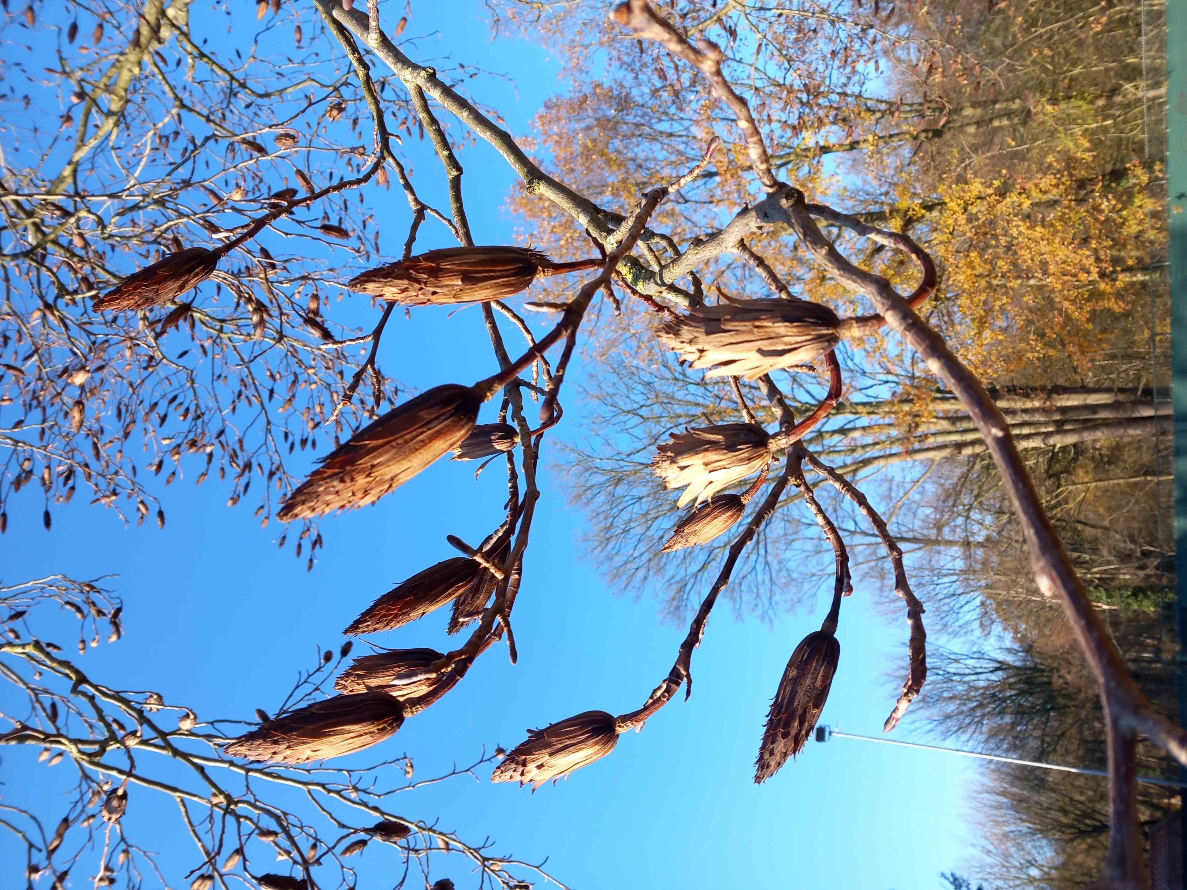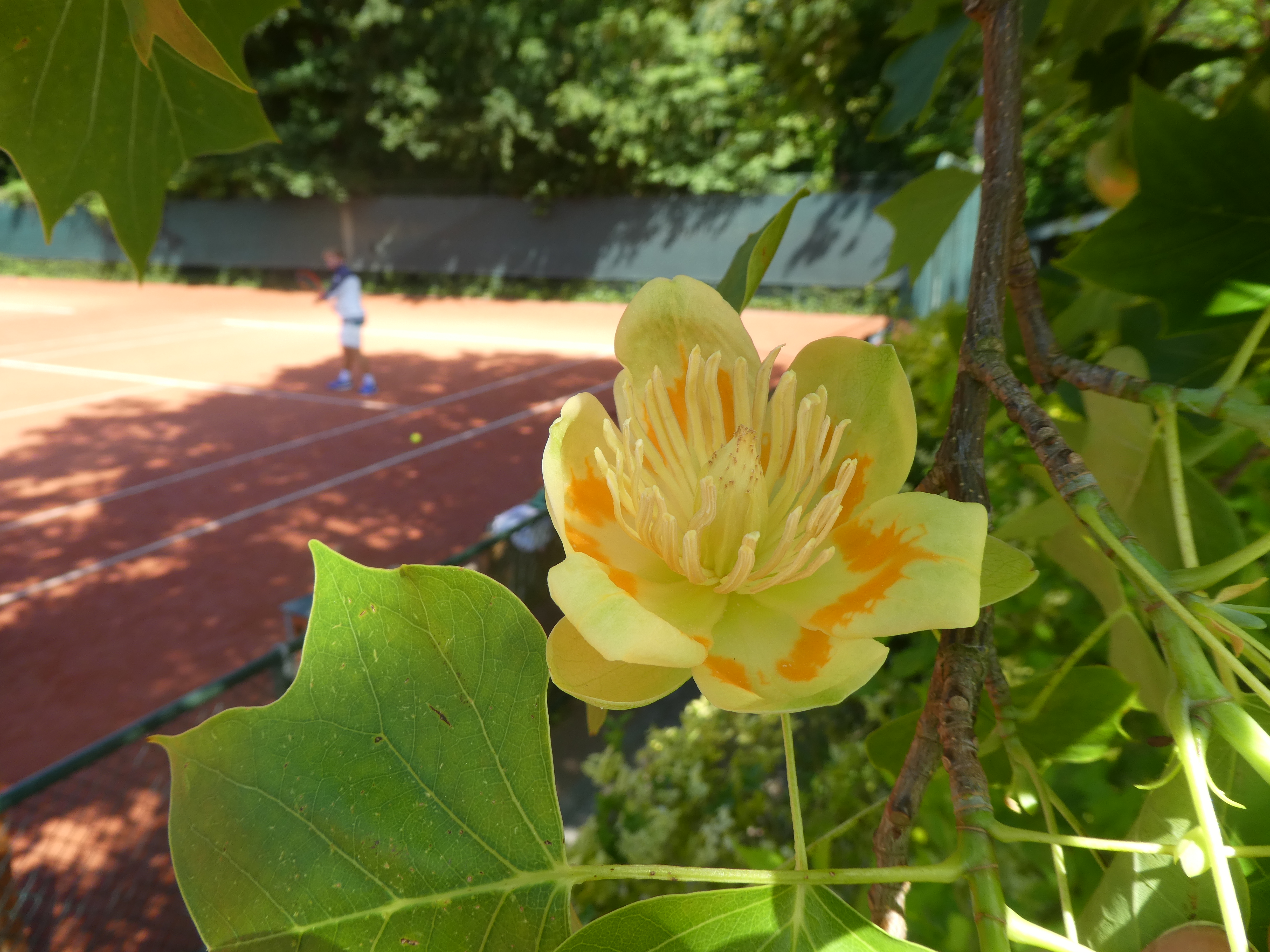 “Ik kom hier iedere dag langs en het is me nog nooit opgevallen,” zegt Tim. De tulpenboom (Liriodendron is zijn deftige Latijnse naam) staat tussen baan 4 en 5. De tulpen bloeien nu, maar de meesten van ons zien het niet. We komen tenslotte om te tennissen. “Maar heeft een tulpenboom geen witte bloemen?” vraagt een van de koffiedrinkende vrouwen aan mij. Ja, de magnolia bloeit wit/ roze vroeg in het voorjaar en wordt ook wel tulpenboom genoemd. Maar de echte tulpenboom bloeit nu. En op de foto’s zie je hoe mooi! In de winter blijven de forse zaadvruchten lang hangen. In de dan bladloze boom vallen die enorm op.