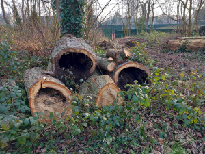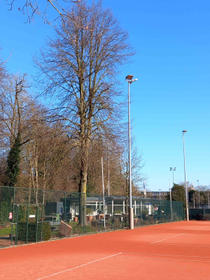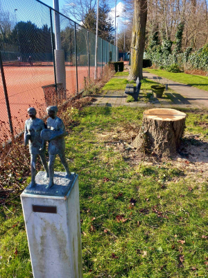 Wij hadden twee lindes langs de banen 2 en 3. De dikste was iets meer dan 230 cm in omtrek. Acht jaar terug attendeerde een boomdeskundige tegenstander mij op de op zeven meter hoogte zittende zwammen. Sinds die tijd kwam er ieder jaar wat minder blad aan de boom en afgelopen jaar was het zo goed als niets. Dinsdag 4 februari is de boom geveld. Dat is altijd een spectaculair gezicht. Een gehelmde boomklimmer werkt zich langs de stam omhoog en zaagt takken af. Hij kort de stam in en klimt weer naar beneden. Dan wordt de zaag onder in de stam gezet en valt vervolgens het restant met een fikse klap op de grond. De ontmanteling van onze linde heb ik niet live meegemaakt. De beelden daarvan hebben we aan Emmy te danken.