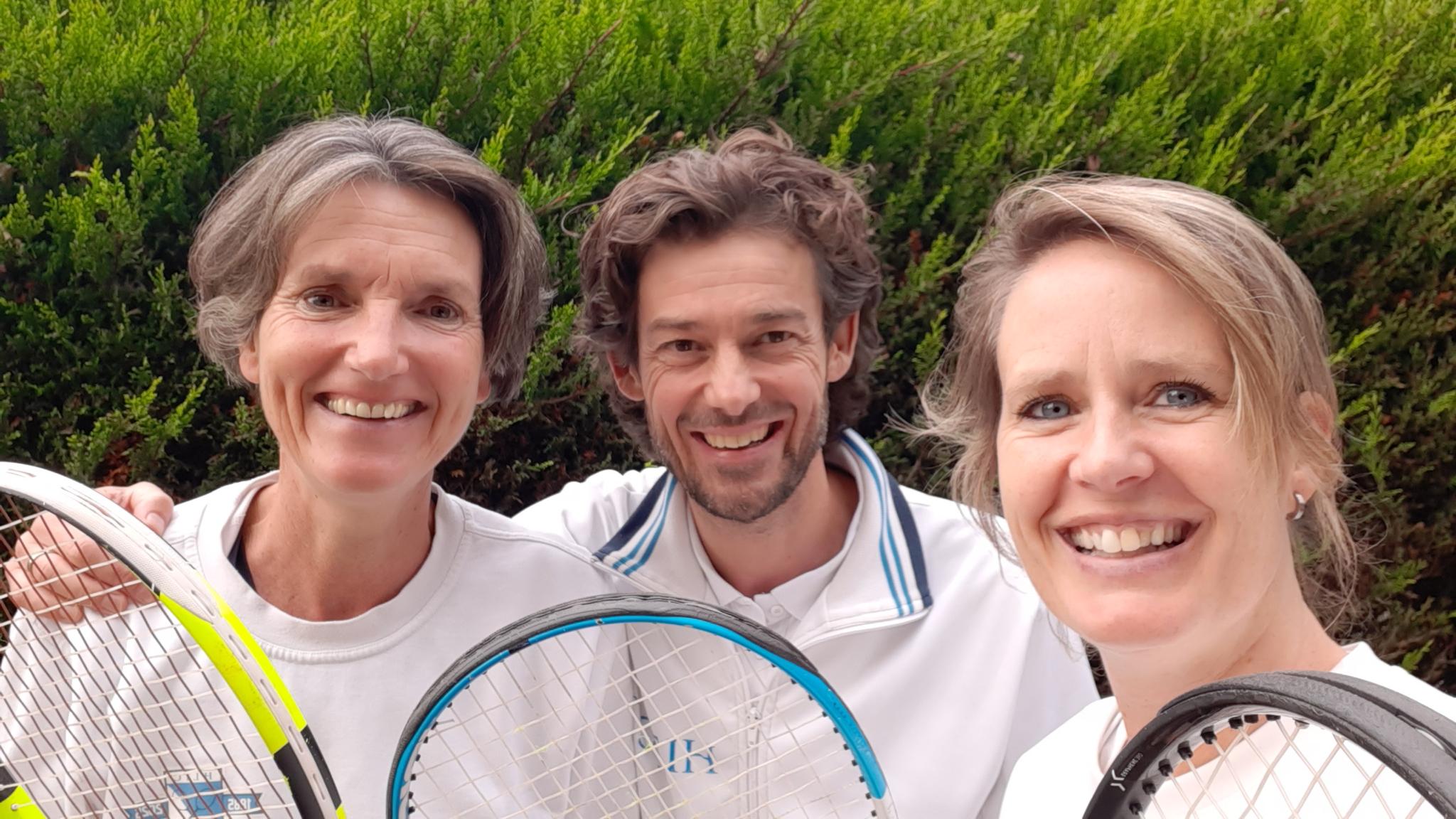 Jacob Lenting, Stijn de Groot en de neefjes Tabe en Pim Kist vormen de kern van Junioren 2. Stijn heeft verpletterende cijfers op zijn naam staan: 10x winst en geen verliespartij. Toch ging het niet altijd makkelijk, want in de eerste ronde tegen Overhout had hij twee 3e set-tiebreaks nodig om de zeges binnen te halen. Tabe deed ook vijf keer mee. Hij had het mooie rapport van 8x winst tegen twee verliespotten. Jacob en Pim hebben niet alle keren meegedaan en dan kost het de nodige hoofdbrekens om het team compleet te krijgen. Liefst vijf invallers hebben een keer meegedaan, twee potten gespeeld en zo bijgedragen aan het kampioenschap: Philine, Pepijn, Kees, Abel en Joost. De laatste twee zijn ook lid op Zandvoort. “Net op tijd van de transfermarkt geplukt”, meldt Fleur mij. Zij reikte de kampioensmedailles uit. Op de foto staan vlnr Stijn, Tabe en Pim die hun tanden stuk bijten op het eremetaal.